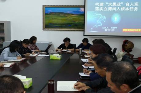 10月9日下午,在崇文樓(B)221,旅游與地理學(xué)院開展了學(xué)習(xí)講堂專題講座活動,黨總支書記崔麗輝作了題為“構(gòu)建‘大思政’育人觀,落實立德樹人根本任務(wù)”的專題講座,全體教職工參加了學(xué)習(xí)。