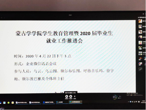 4月22日下午,蒙古學學院召開線上學生教育管理暨2020屆畢業生就業工作推進會。蒙古學學院黨總支書記烏云、副書記烏云圖、團學辦主任額爾布樂圖、副主任呼格吉樂瑪及輔導員、班主任參加會議。會議由烏云圖副書記主持。