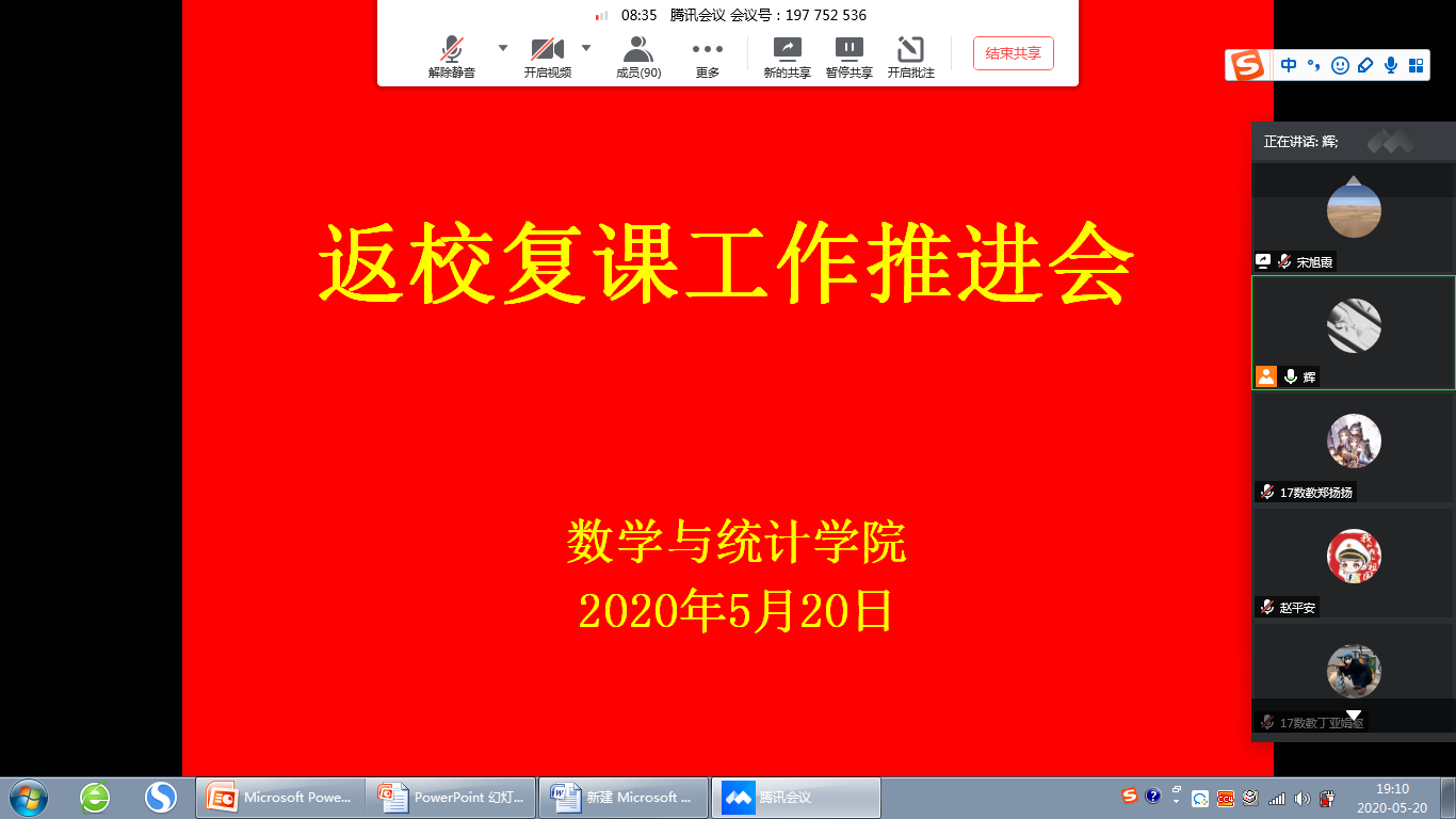 5月20日晚,數(shù)學(xué)與統(tǒng)計(jì)學(xué)院通過騰訊會議召開了返校復(fù)課工作推進(jìn)會,學(xué)院黨總支副書記宋旭霞、團(tuán)學(xué)辦主任敖巖輝、畢業(yè)班輔導(dǎo)員、班主任及返校畢業(yè)班全體同學(xué)參加了會議。
