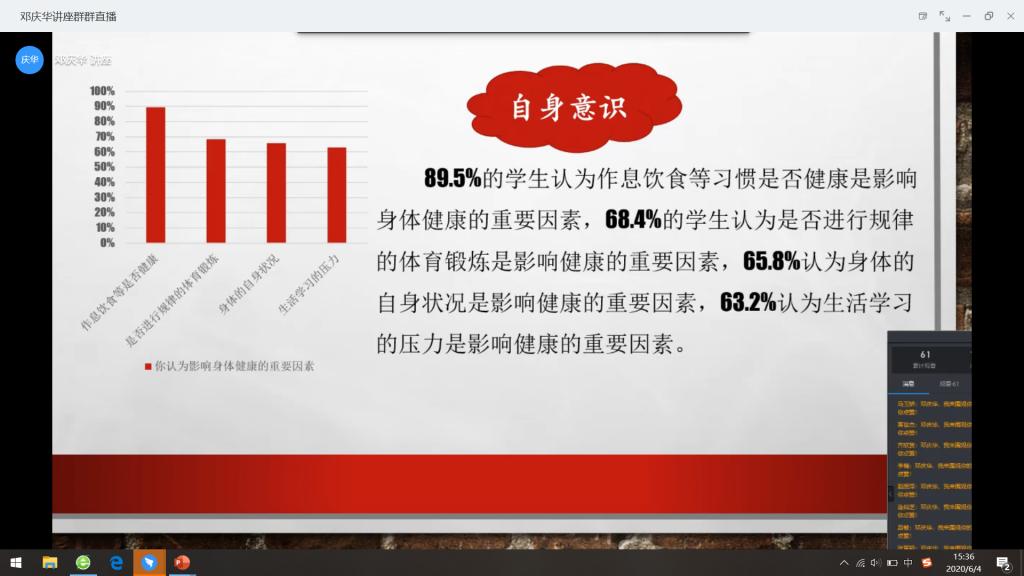 講座中鄧慶華老師以在線問卷調查為基礎,呈現了當代大學生健康狀況調查結果,并從飲食習慣、身體鍛煉、作息時間、自身意識四個方面進行了具體分析。從數據顯示,大學生在飲食習慣方面是基本健康、營養的;學生能夠意識鍛煉身體的重要性,但是在時間和周期還沒有達到標準,現狀不容樂觀;絕大多數學生作息時間良好,但是不午睡的人數偏多。最后,鄧老師結合實際情況從以上四個方面給與了合理建議,并希望通過本次的分析和建議,能夠指導大學生改善身體健康狀況。