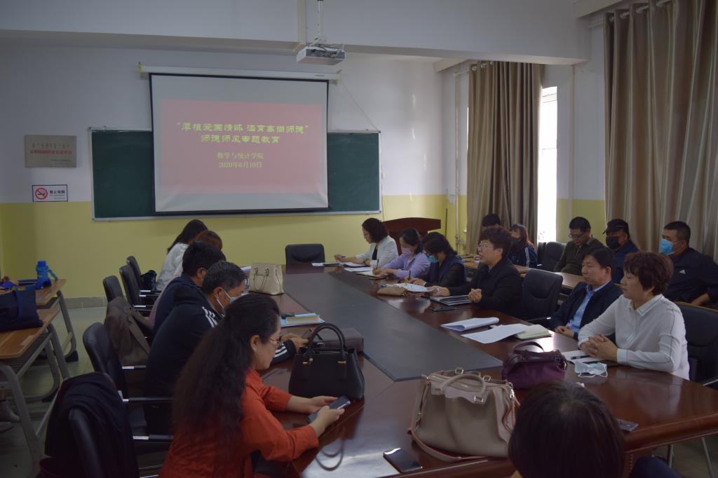 6月10日下午,數學與統計學院開展“厚植愛國情懷 涵育高尚師德”師德師風專題教育活動,活動由萬阿英院長主持,全體教職工參加了本次活動。