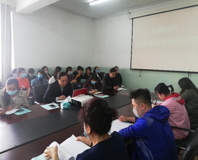 6月10日下午,外國語學院在414會議室開展了“厚植愛國情懷 涵育高尚師德,加強新時代教師隊伍建設”專題培訓,全體教師學習了“專業課程融入思政工作的教學設計理念與方法”的課程,培訓會由外院黨總支書記陳昭明主持。
