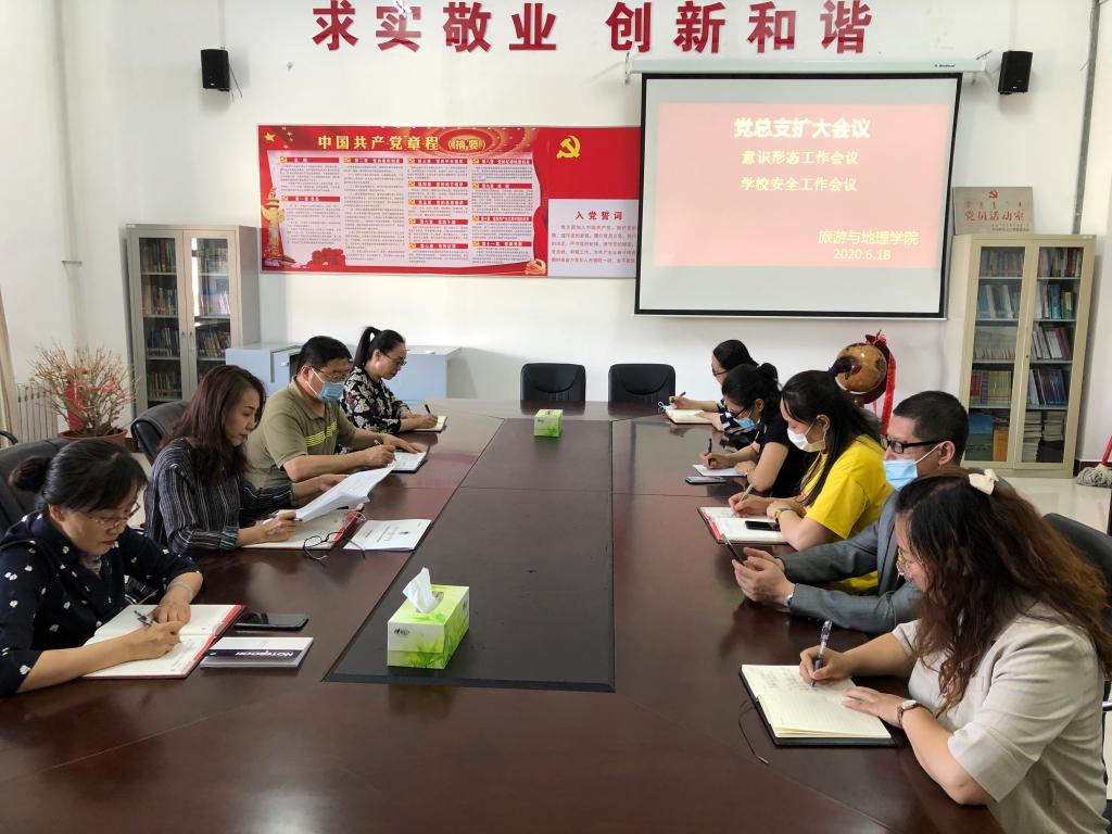 6月18日下午,旅游與地理學院在崇文樓B座221室召開推進意識形態工作、學校安全工作黨總支擴大會議。參加會議的有旅游與地理學院班子成員、教師和學生支部書記、團學辦主任和副主任、綜合辦公室主任。會議由黨總支書記崔麗輝主持。