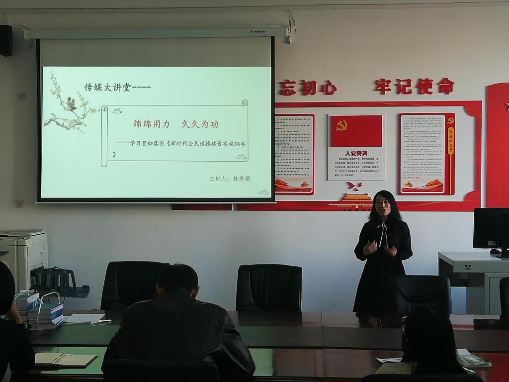 最后,林秀麗副院長以傳媒學院大講堂為平臺,組織全體教職工學習了《新時代公民道德建設實施綱要》,引導全體教職工加強道德修養、提高道德水平,要求廣大教師要以德立身、以德立學、以德施教、以德育德,爭做有理想信念、有道德情操、有扎實學識、有仁愛之心的“四有”好老師,做好學生成長成才的領路人,為學生修德立身樹立榜樣。