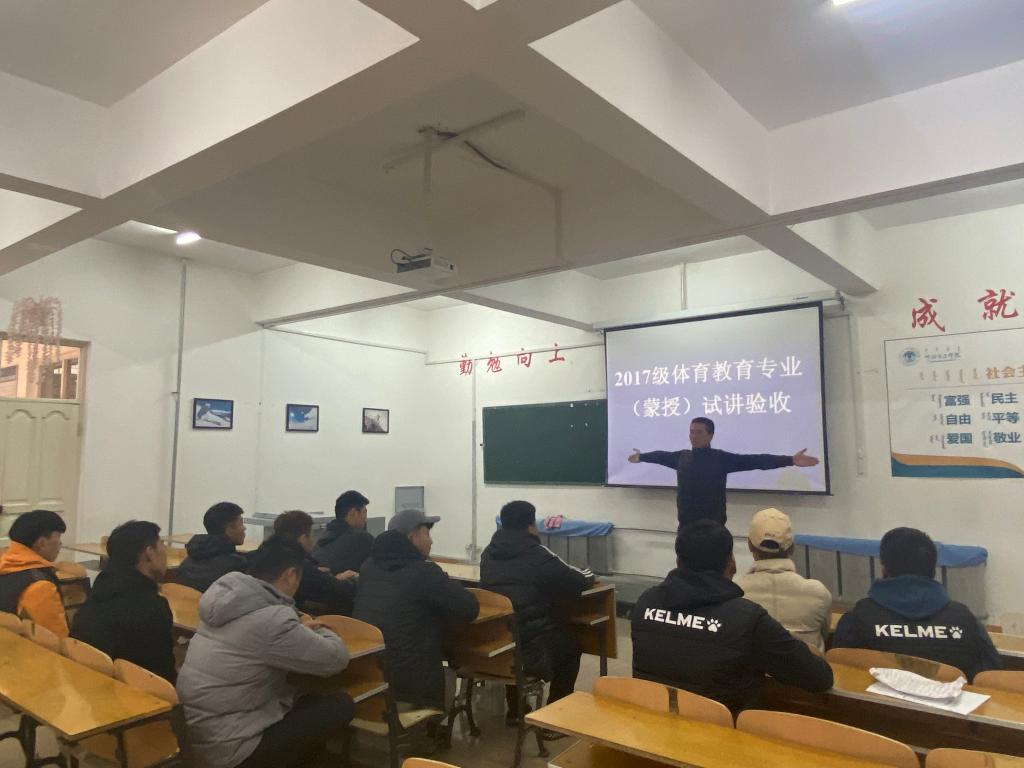 為檢驗大學生綜合素質和教學能力,強化大學生課堂教學技能水平,提升學生的就業能力,體育學院體育教育系于9月23至10月4日,開展了2017級體育教育專業畢業生試講驗收專項工作,2017級體育教育漢本班和體育教育蒙本班全體學生參加了此次驗收。在體育教育系主任周慶柱和副主任姜瑩兩位老師的協同下,同學們嚴格按照中學體育教學中對體育教師的要求標準講授教學。