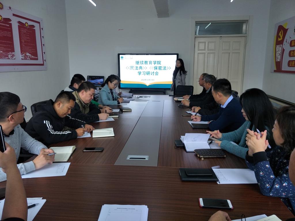 為切實(shí)做好民法典的學(xué)習(xí)宣傳貫徹和推動(dòng)實(shí)施工作,10月14日,繼續(xù)教育學(xué)院邀請(qǐng)法學(xué)院王丹老師為全體教職工舉辦《民法典》、《保密法》學(xué)習(xí)、研討會(huì)。