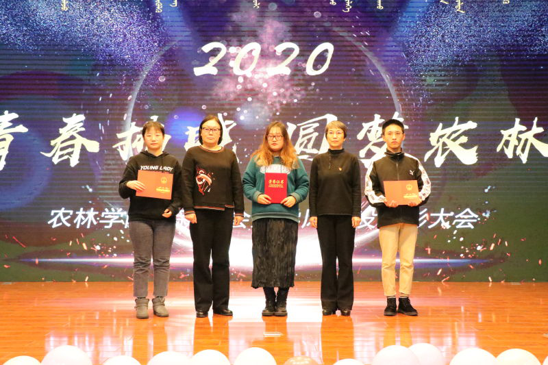 晚會中場進行表彰頒獎。謝紅嶺書記為2019—-2020學年度國家獎學金、國家勵志獎學金、“烏蘭夫”獎學金、“勤則通”助學金的優秀學生代表頒發榮譽證書;烏仁其其格院長為2019年度“優秀團支部”頒發榮譽證書;王兆文主任和龐雅文書記分別為2019年度“優秀學生會干部”、“優秀共青團員”以及“優秀青年志愿者”頒發榮譽證書。