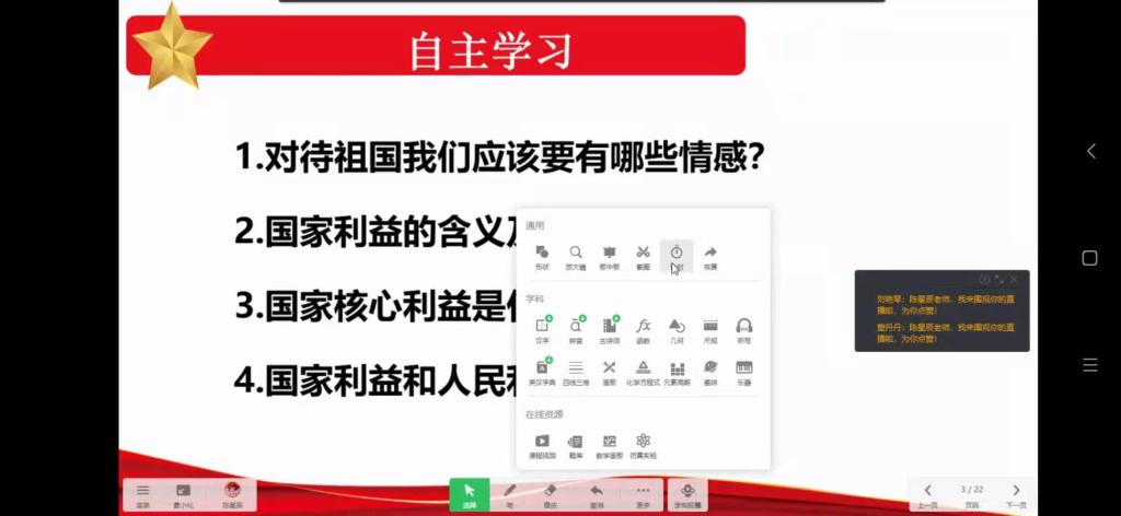 課上,各位老師以全新的教學理念為大家呈現(xiàn)了一節(jié)又一節(jié)精彩紛呈的網(wǎng)課。教學過程中充分體現(xiàn)了學生的主體地位,注重引導學生自主學習,培養(yǎng)他們發(fā)現(xiàn)問題、解決問題的能力,體現(xiàn)了師生之間的主導與主體作用。熟練的教學內容,嫻熟的教學技能,富有激勵性的課堂用語使每位同學深受感染。