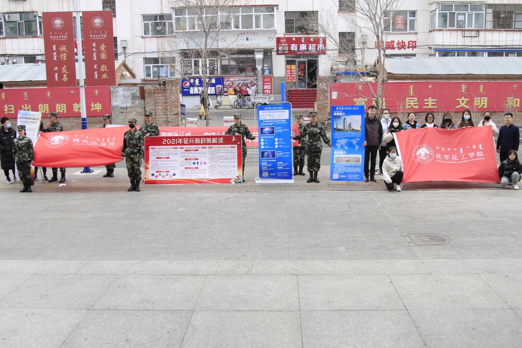 為認(rèn)真宣傳、落實(shí)2021年全國(guó)高校大學(xué)生入伍預(yù)征工作政策,幫助廣大畢業(yè)生、在校生了解掌握應(yīng)征入伍的相關(guān)政策,加強(qiáng)宣傳力度,3月23日,化學(xué)化工學(xué)院在餐飲中心前組織開(kāi)展了“入伍預(yù)征宣傳暨政策咨詢”活動(dòng)。學(xué)院黨總支副書(shū)記劉朋、團(tuán)學(xué)辦主任張一帆、團(tuán)總支書(shū)記孟慶永及學(xué)校民兵應(yīng)急營(yíng)戰(zhàn)士、學(xué)院學(xué)生會(huì)成員參加宣傳活動(dòng)。