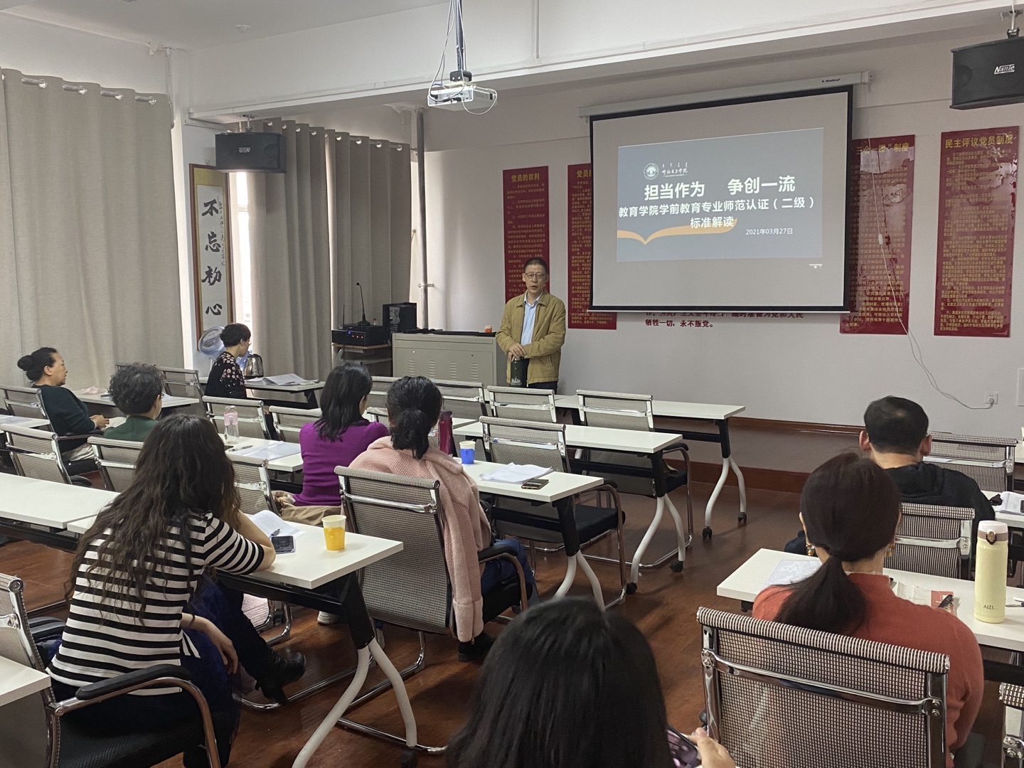 解讀、準確理解和熟記師范專業認證標準工作指南是開展專業認證的前提條件和重要基礎。3月27日,利用周六休息時間,學前教育專業師范專業認證工作領導小組的全體成員和學前專業所有任課教師在藝術樓501會議室召開了“擔當作為 爭創一流”教育學院學前教育專業師范認證(二級)標準解讀專題研討會。學院其他專業的系部主任和部分教師也自愿參加會議。會議由教育學院院長王毅主持。在為期一天的研討中,八位負責人根據對文件的學習解讀并結合標國家標準,以PPT的形式將一級指標分別逐字逐句進行解讀,分別從二級指標的內涵解、考查要點和佐證材料三個方面對學前教育專業目前的現狀和需要開展的工作進行了梳理分析,參會教師在此基礎上進行了研討,在一級指標解讀學習之后,學前專業帶頭人敖敦教授對師范認證的重點和難點進行整體梳理,最后王毅院長做了會議總結。和通過一天的討論學習,參會教師們不僅對師范專業認證的工作達成了清晰明確的共識,落實了對下一步工作任務和責任,學前專業全體教師和學院各部門都要積極行動起來,各司其職、各負其責,通力合作,推動學前教育專業師范類專業認證工作能夠順利有序開展。