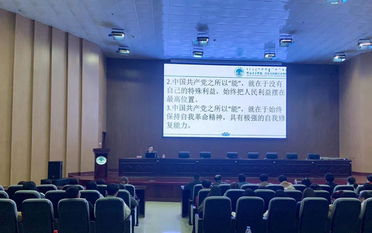在即將迎來(lái)中國(guó)共產(chǎn)黨百年華誕之際,為更好的推動(dòng)黨史學(xué)習(xí)教育的開(kāi)展,歷史文化學(xué)院結(jié)合專(zhuān)業(yè)特點(diǎn),組織開(kāi)展黨史學(xué)習(xí)教育系列講座。4月14日下午,在圖書(shū)館四樓報(bào)告廳,歷史文化學(xué)院烏日?qǐng)D院長(zhǎng)以《從黨的理論創(chuàng)新看中國(guó)共產(chǎn)黨為什么“能”》為題進(jìn)行了宣講,也為學(xué)院黨史學(xué)習(xí)教育系列講座拉開(kāi)了序幕。講座由學(xué)院黨總支書(shū)記梁云主持,全員教職工共400多人聆聽(tīng)了講座。