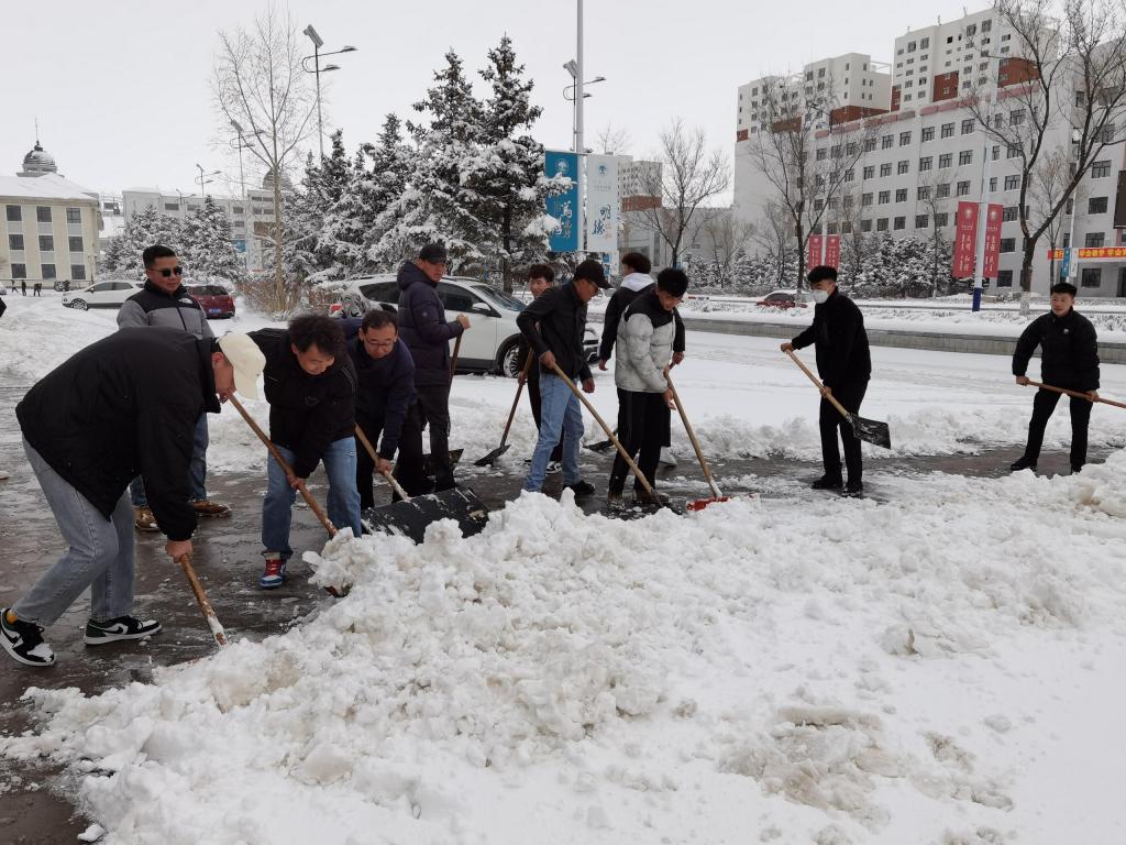 參與志愿活動的同學們,拿好自己的工具,投入到清掃積雪的“戰斗中”。大家揮舞著手中的鐵鍬和鐵鏟對藝術樓門口的積雪進行清掃,有的鏟、有的推,齊心協力,配合默契。寒冷的天氣被同學們的熱情所覆蓋,他們在雪地里忙碌的身影成為校園里最亮麗的風景,讓這個寒冷的四月也變得格外溫暖。