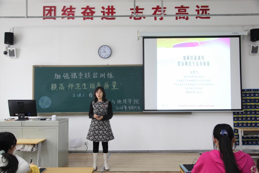 為提高師范生培養(yǎng)質(zhì)量,更好地完成師范專業(yè)認(rèn)證準(zhǔn)備工作,4月15日,旅游與地理學(xué)院副院長白絮飛教授在崇文樓B座331教室開展了“加強(qiáng)課堂技能訓(xùn)練,提高師范生培養(yǎng)質(zhì)量”的專題講座,講座圍繞師范生職業(yè)意識(shí)、師范生必須掌握的教育教學(xué)技能展開,旨在培養(yǎng)未來合格的人民教師。