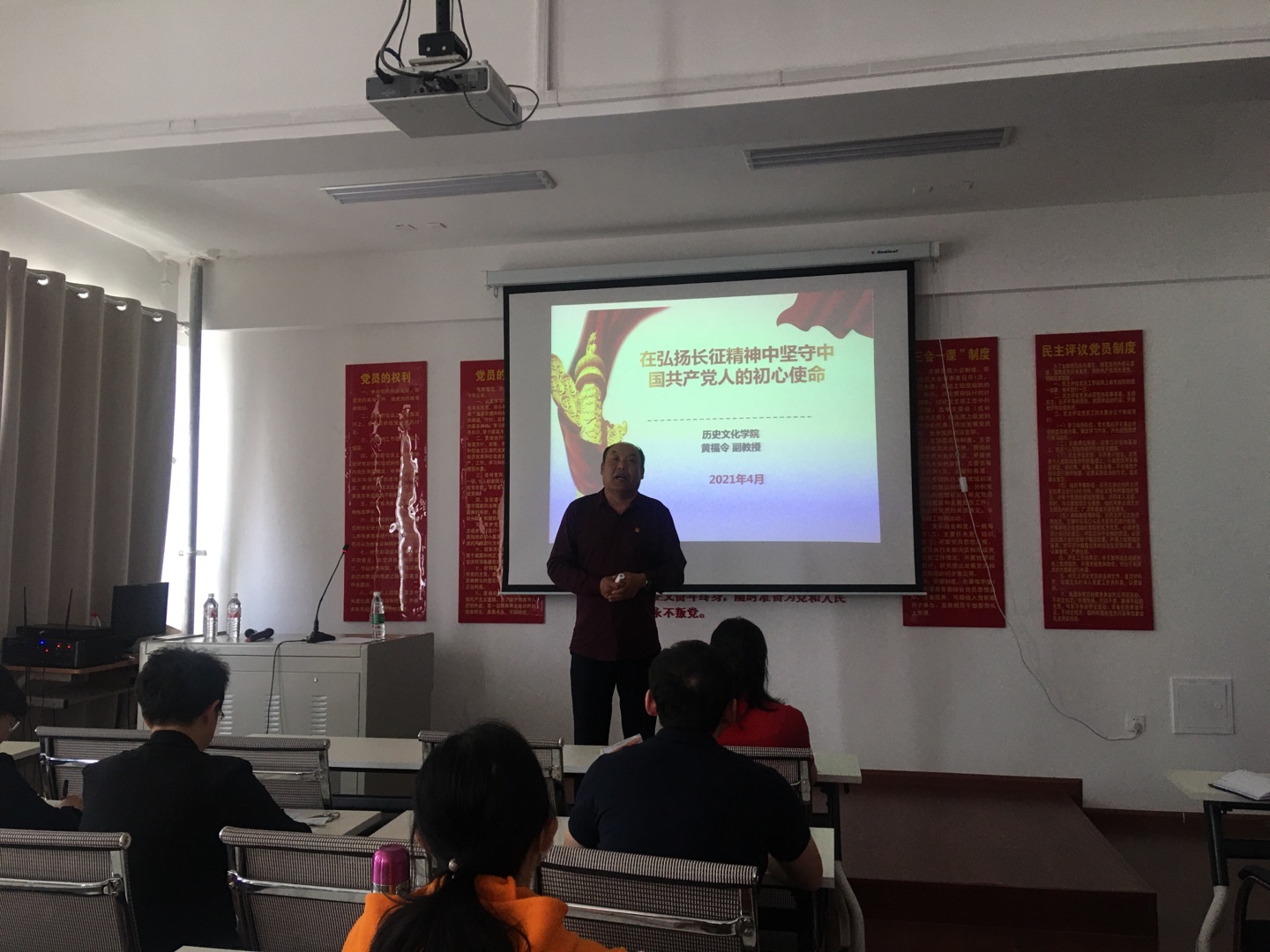 黃福令副教授以“在弘揚(yáng)長(zhǎng)征精神中堅(jiān)守中國(guó)共產(chǎn)黨人的初心使命”為主題,圍繞紅軍長(zhǎng)征路線,從遵義會(huì)議轉(zhuǎn)折、巧渡金沙江、強(qiáng)渡大渡河、飛奪瀘定橋、爬雪山過草地、攻克天險(xiǎn)臘子口、三大主力會(huì)寧會(huì)師等節(jié)點(diǎn)生動(dòng)地詮釋了長(zhǎng)征精神的實(shí)質(zhì)內(nèi)涵。黃福令副教授聲情并茂地講述了紅軍悲壯、艱苦卓絕的長(zhǎng)征歷程,帶領(lǐng)大家回顧了那段炮火硝煙的歲月。