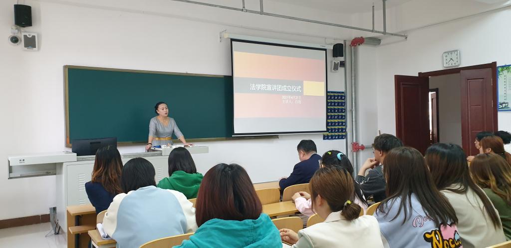 4月21日下午,法學院在B425舉行了法學院新時代師生宣講團成立儀式,特別邀請校黨委宣傳部理論教育科科長白玫老師為師生開展了理論宣講專題知識講座。黨總支副書記白杰主持會議,團學辦、綜合辦、指導教師及宣講團全體學生參加了會議。