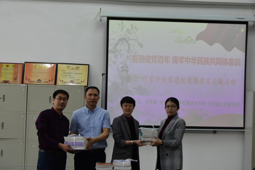 在第26個世界讀書日來臨之際,為慶祝建黨百年、助推黨史學習、鑄牢中華民族共同體意識,4月21日,文學院朔風文學社、文學研究所聯合呼倫貝市作協、市評協在文學院會議室舉辦了“喜迎建黨百年,鑄牢中華民族共同體意識”作家評論家進校園讀書日主題活動。呼倫貝爾市評協副主席、文學院院長曹存有主持活動。呼倫貝爾市文聯副主席、市作協主席姚廣,市評協主席,文學院教授王云介和相關人員參加活動。