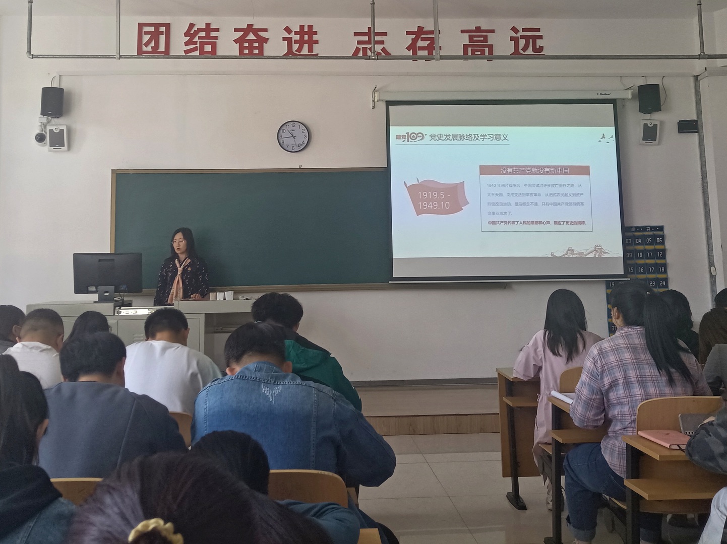 白絮飛副院長結合古往今來中國歷史的巨變,為同學們講解中國黨史的發展脈絡及學習黨史的意義。“百年征程波瀾壯闊,百年大黨風華正茂。”白絮飛副院長將一塊塊歷史痕跡的碎片清晰的展示給同學,告訴同學們黨的百年歷程并不是一蹴而就,黨的成功是必然的但一定不是容易的。“從1921年開天辟地的中國共產黨成立,再到如今‘十四五’時期開啟全面建設社會主義現代化國家的新征程,百年崢嶸歲月,黨的光輝一直照耀著人民。”白絮飛副院長講述召開十九次的人民代表大會凸顯黨的艱辛歷程,讓同學們更加明白只有中國共產黨才能實現中國人民從站起來到富起來再到強起來,同時提到了中國夢及其核心目標“兩個一百年”。