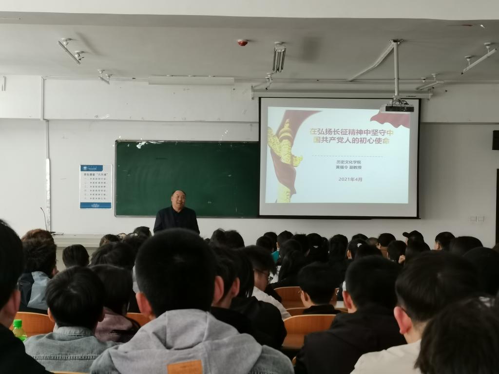 “弘揚長征精神這一政治優勢,無論過去、現在和將來,都是我們戰勝困難和風險、解決問題、創造新業績不可缺少的強大精神動力。雖然再沒有雪山和草地,但我們同樣面臨著歷時和時代的挑戰。長征精神所體現的這種為民族不畏艱險、不怕犧牲、艱苦奮斗的民族使命感和歷史責任感,正是中華民族“天下興亡,匹夫有責”,百折不撓、頑強拼搏、自強不息偉大民族精神的生動展現。”黃福令老師以“紅軍長征路線示意圖”為主線,從長征的原因、轉折點、意義三個方面,以“四渡赤水”“懋功會師”“吳起鎮會師”深刻細致地為師生講述了長征的故事和長征精神。