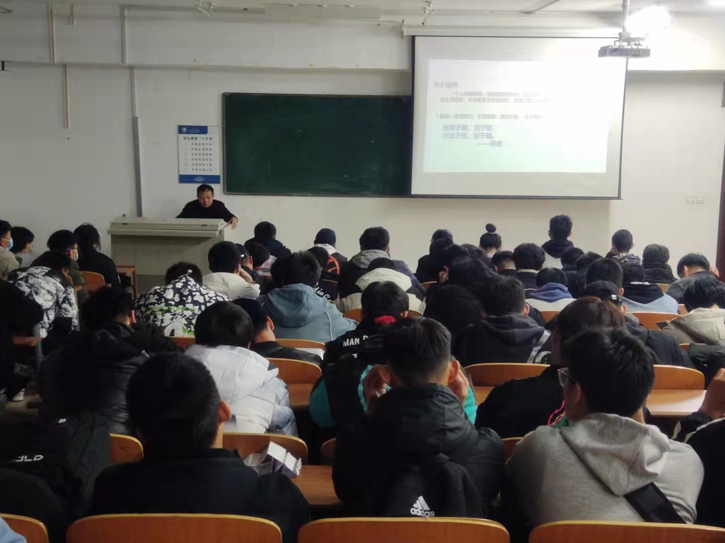 王旭書記首先向2021級(jí)新同學(xué)表示熱烈的祝賀和對(duì)未來(lái)良好的祝愿。他以目前的就業(yè)形式作為本次講座的切入點(diǎn),從適應(yīng)新的環(huán)境、確立新的目標(biāo)、對(duì)大學(xué)生活的幾點(diǎn)建議的三大方面,以生動(dòng)的語(yǔ)言,豐富的案例,旁征博引、深入淺出地進(jìn)行了講解,多次引起同學(xué)的共鳴。在講到對(duì)同學(xué)的幾點(diǎn)建議時(shí),王旭書記從文明修身的角度,從生活習(xí)慣、宿舍衛(wèi)生、著裝、交往等多個(gè)方面,詮譯了良好的道德修養(yǎng)對(duì)一個(gè)人人生的影響。