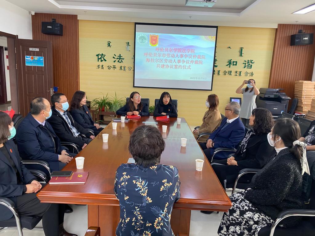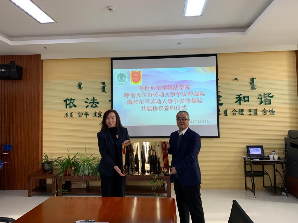 會后,馬斌院長分別與呼倫貝爾市勞動人事爭議仲裁院、海拉爾區勞動人事爭議仲裁院領導在共建協議書上簽字,舉行了法學教育實踐基地揭牌儀式。