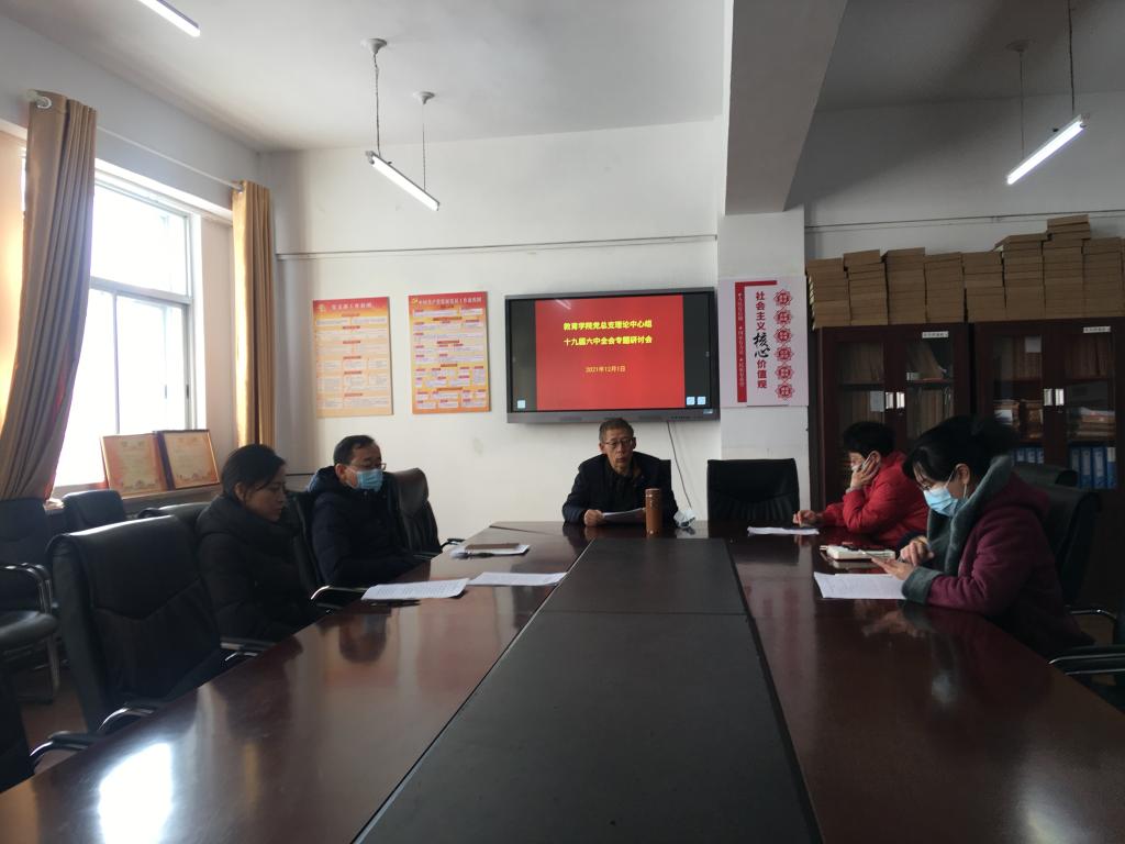 12月1日上午,教育學院黨總支理論中心組在藝術樓210會議室召開“學習貫徹黨的十九屆六中全會精神專題研討會”。會議由教育學院黨總支書記姜明紅主持,黨總支理論中心組成員參加了會議。