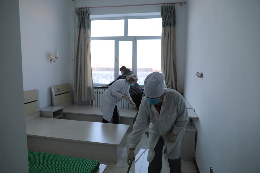 會后,領導干部迅速投身于籌備工作,由曹力猛副主任牽頭指揮現場工作。校區全體教職工眾志成城,分組落實工作,對作為隔離區域的新宿舍樓進行行李備品的更換、打掃和消殺,為隔離人員提供舒適的隔離環境。在準備過程中,牙克石市政府副市長、公安局局長孟繁星、牙克石市政府副市長張昕宇、牙克石市住建局黨組書記、局長李浩和相關科局一行領導親自蒞臨現場查看,做進一步工作安排和部署。