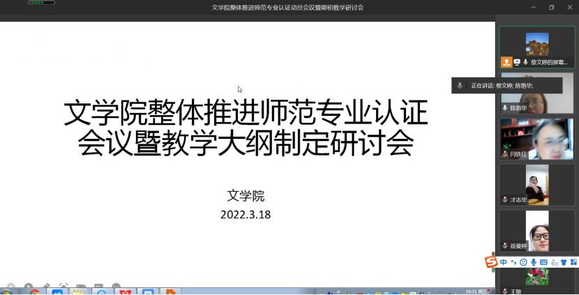 為扎實推進師范專業認證工作,促進師范專業認證申報工作有序進行,3月18日,文學院召開“整體推進師范專業認證動員會暨期初教學研討會”。根據疫情防控要求此次會議采用線上方式進行。會議由文學院副院長蔡文婷主持。