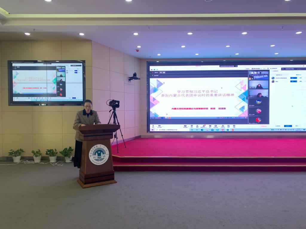 胡清惠教授以“學習貫徹習近平總書記參加內蒙古代表團審議時的重要講話精神”為主題,圍繞著習近平總書記歷次在參加內蒙古代表團審議時發表的重要講話、從黨和國家工作大局統籌民族工作等方面進行了詳細講解。講解深入淺出,突出學理性、啟發性和思想性,結合時事熱點將習近平新時代中國特色社會主義思想融入到集體備課當中。胡清惠教授指出,習近平總書記在參加內蒙古代表團審議時的重要講話為書寫新時代內蒙古高質量發展新篇章提供了強大的思想武器和科學的行動指南,要緊緊抓住鑄牢中華民族共同體意識這個新時代黨的民族工作的“綱”,用心用情用力呵護好“模范自治區”崇高榮譽,以鑄牢中華民族共同體意識為主線推進各項工作,以實際行動迎接黨的二十大勝利召開。