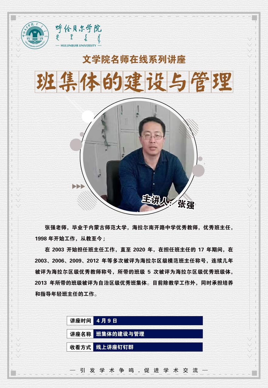 為進一步提升文學院漢語言文學專業師范生的基本素養和班主任工作能力,為師范專業人才培養質量夯實基礎,文學院特聘請海拉爾區各中學一線優秀教師開展名師系列講座。4月9日上午,文學院名師系列講座第一講特邀海拉爾區南開路中學優秀教師、班主任張強老師通過釘釘線上直播的方式開講“‘班集體建設和管理’初中班主任工作”。文學院2018級、2019級漢語言文學專業和2019級和2020級語文教育專業師范生共計320余名學生,文學院實訓中心主任和班主任老師收聽講座。