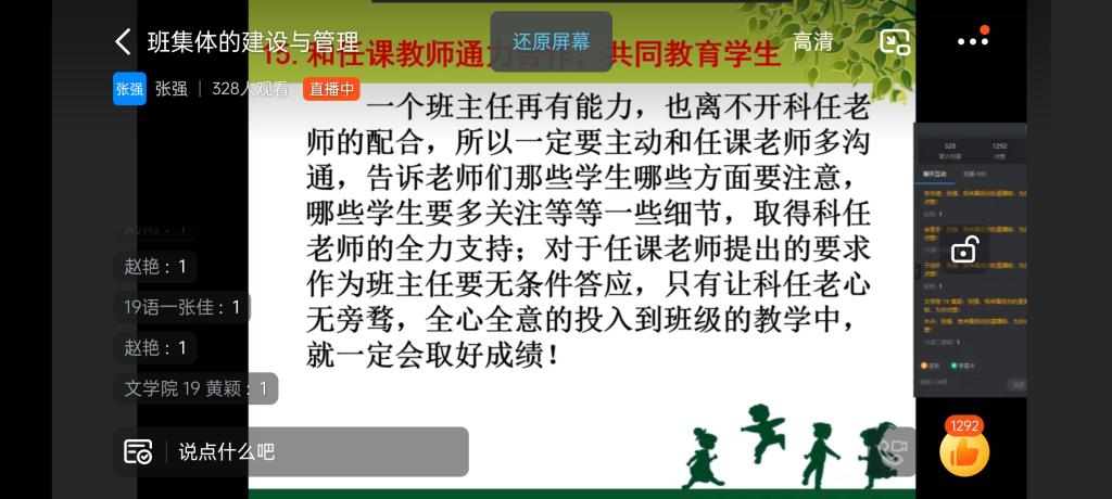 講座中,張強老師把自己班主任工作經驗高度凝練,講解和分析初中各年級的重點工作,總結了18個工作細節,從精心設計好入學的第一次見面到家訪工作主要做的工作,如何選拔班干、制定班集體個人近期目標、制定一套較為完整且容易操作的班規等方面,把他多年班主任工作成熟的經驗傾囊相授。收聽、觀看本次講座的師生學到了很多實用的班主任工作經驗,更加清楚和明晰班主任要做的各項工作。