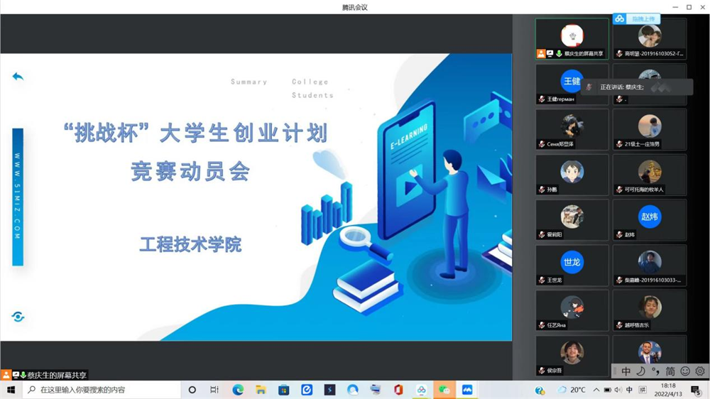 為深入貫徹落實習近平總書記給給第三屆中國“互聯網+”大學生創新創業大賽“青年紅色筑夢之旅”大學生回信重要精神,加快培養創新創業型人才,4月13日下午,工程技術學院通過線上會議的形式舉行了“互聯網+”大學生創新創業大賽和“挑戰杯”大學生創業計劃競賽培訓暨動員大會。各年級班長,團支書,學委參加會議。工程技術學院團總支書記蔡慶生老師主持會議。