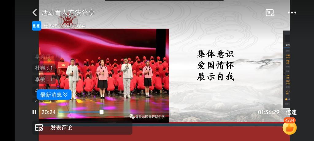 任彬彬老師通過豐富的班主任工作案例、活動圖片、音視頻等形式,分享了自己多年來擔任班主任開展育人活動的經驗。她詳細介紹了怎樣結合中學語文教學中活動育人的方法,在活動中樹立中學生正確的世界觀、人生觀和價值觀,讓愛國主義精神在青少年心中牢牢扎根。