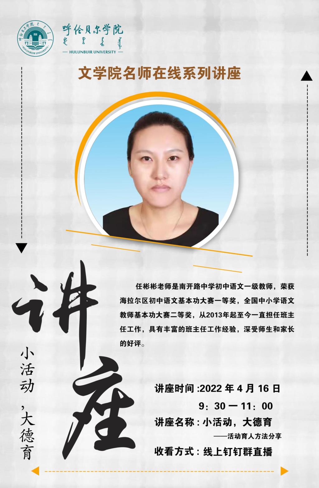 4月16日上午,文學院名師系列講座繼續開講,本次講座邀請海拉爾區南開路中學初中語文老師任彬彬。講座通過釘釘直播的方式為文學院師范生舉辦了“小活動、大德育”班主任活動育人講座,文學院230余名師范生及文學院部分老師參加。