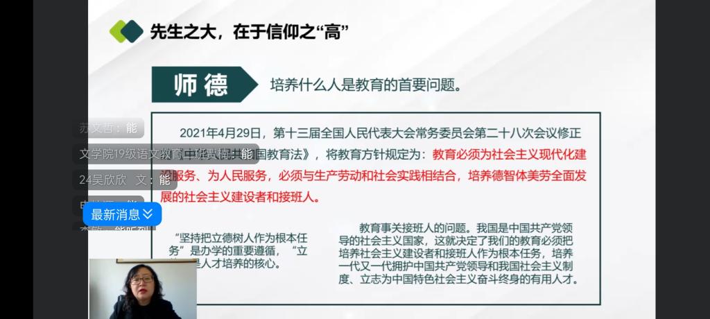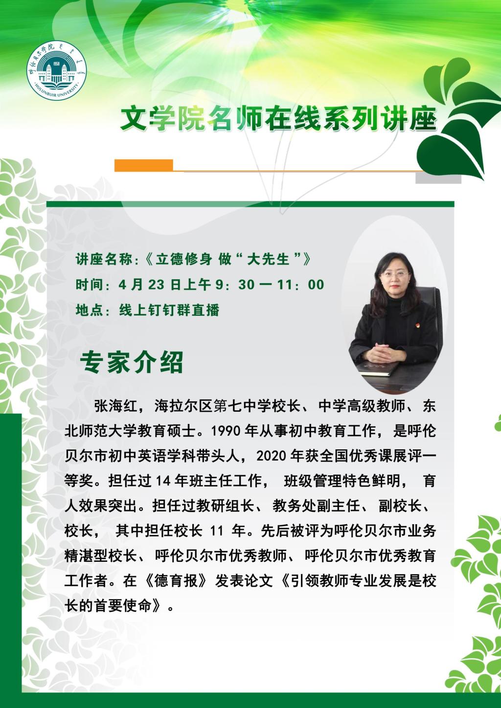 為了進一步提高師范生的師德修養,實現立德樹人的目標,4月23日上午,文學院特邀海拉爾區第七中學校長張海紅作《立德修身 做“大先生”》專題講座,本次線上講座由文學院實訓中心主任曲建華主持,文學院副院長蔡文婷及各年級班主任、文學院240余名師范生參加。