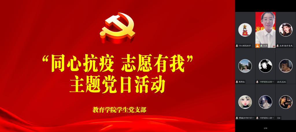 為引導學生黨員認真學習疫情防控期間涌現出的典型事跡和感人故事,強化他們的責任感和使命感,4月29日下午,教育學院學生黨支部開展了“同心抗疫,志愿有我”線上主題黨日活動。教育學院黨總支副書記海江、學生黨支部全體師生黨員參加次會議,會議由教育學院學生黨支部組織委員王晨老師主持。