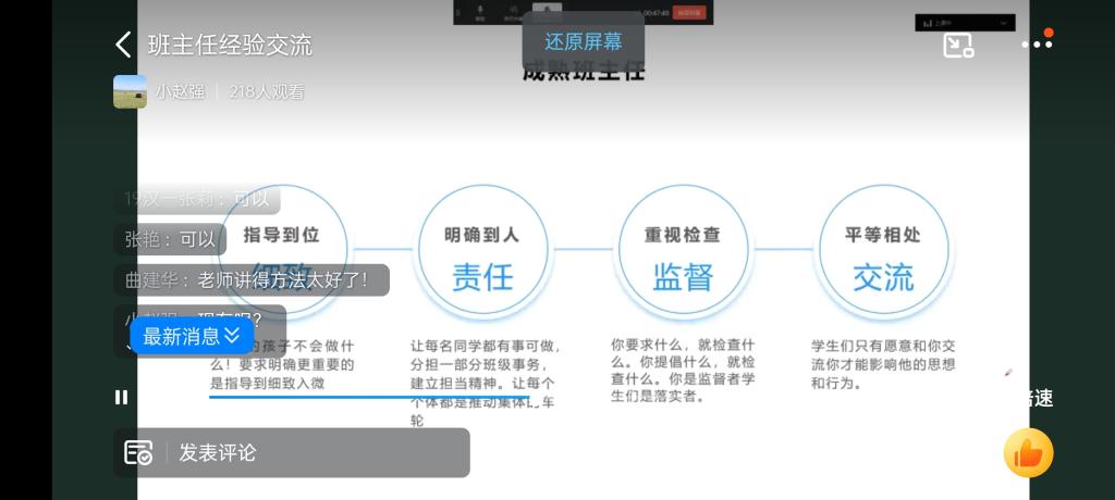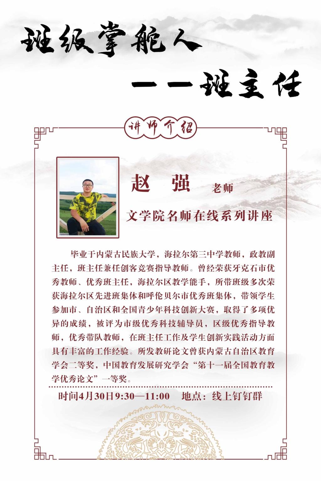 4月30日上午,文學院特邀海拉爾區第三中學趙強老師為文學院師范生以《班級掌舵人——班主任》為主題開展線上專題講座。文學院200余名師范生和文學院副院長蔡文婷、文學院實訓中心主任曲建華以及班主任老師參加本次講座。