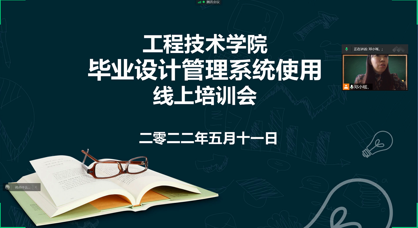 為保障畢業設計工作有序推進,進一步提升畢業設計水平及質量,5月11日下午,工程技術學院通過騰訊會議在線上開展畢業設計管理系統使用培訓會。本次培訓為鄧春瑤老師主講。全體畢業設計指導教師參加培訓會。