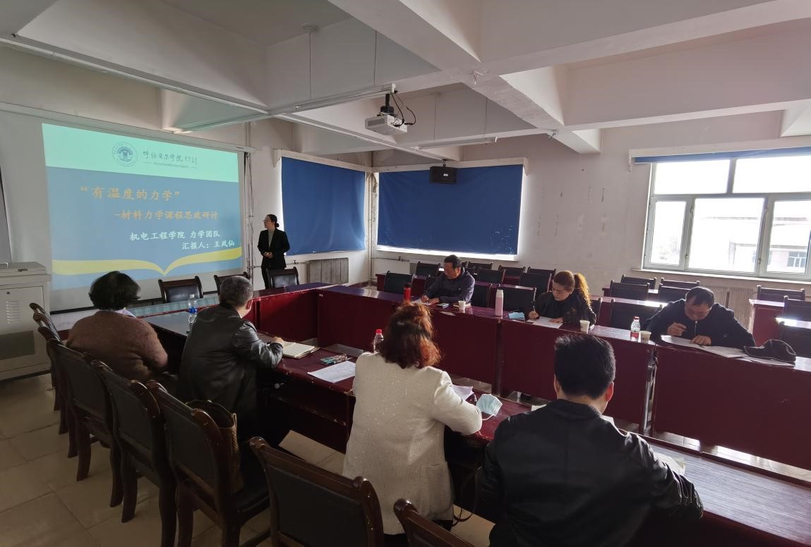 教研活動上,《材料力學》課程團隊負責人王鳳仙老師進行了課程思政建設經驗交流。她介紹了該課程的思政目標,通過具體案例分享了課程思政建設的具體做法。隨后,基礎教學部教師依次結合自己的專業課程思政建設情況分享自己的做法并發表個人見解。最后,督導組三位專家對本次教研活動進行了點評并針對課程思政建設提出了寶貴的意見和建議。