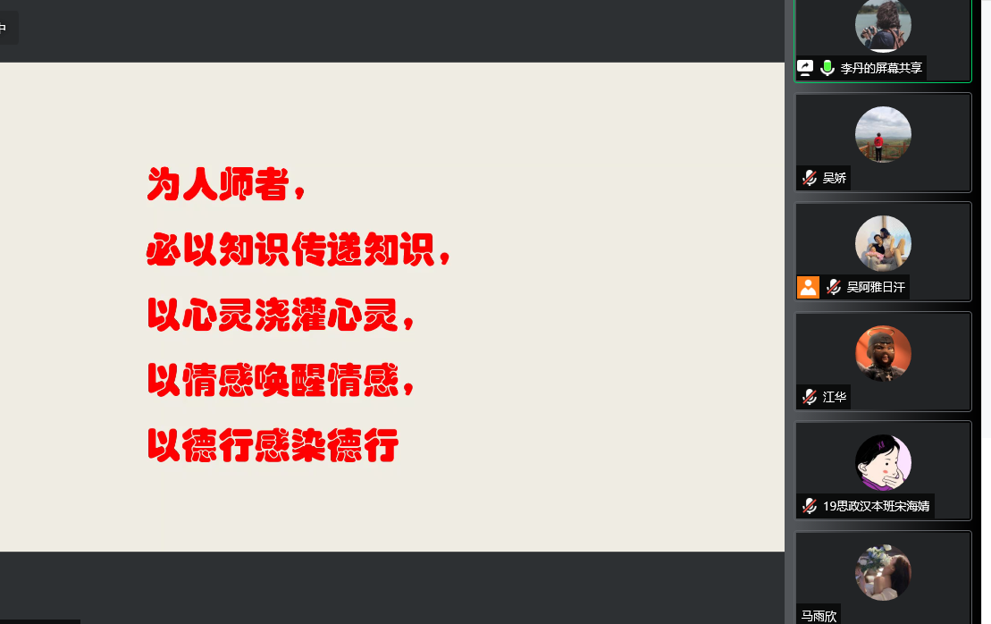 講座中,李丹老師結(jié)合高中《讀本》進(jìn)行教學(xué)設(shè)計(jì),從教材、學(xué)情、教學(xué)目標(biāo)、教學(xué)過程、教學(xué)重難點(diǎn)、教學(xué)方法與手段及教學(xué)反思等方面進(jìn)行了全面的講解。講座結(jié)束后,李丹老師針對(duì)高中教學(xué)中常見問題與學(xué)生進(jìn)行了互動(dòng)交流。隨后,在線的200余名學(xué)生對(duì)高中思政課教學(xué)中的問題、難點(diǎn)和疑惑向李丹老師進(jìn)行了互動(dòng)。教研活動(dòng)在輕松愉悅的氛圍中結(jié)束。