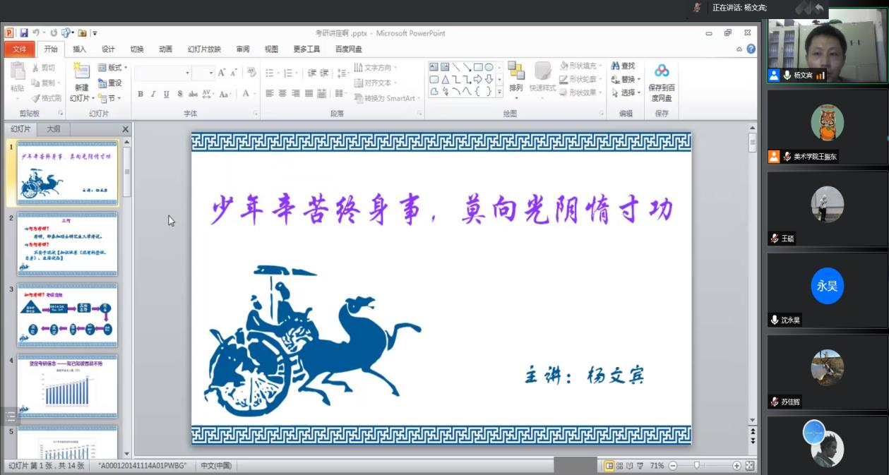 5月26日晚,美術學院通過騰訊會議線上舉行2019級考研經驗分享交流會。美術學院2019級全體學生參加,會議由輔導員陳征老師和楊文賓老師主持。