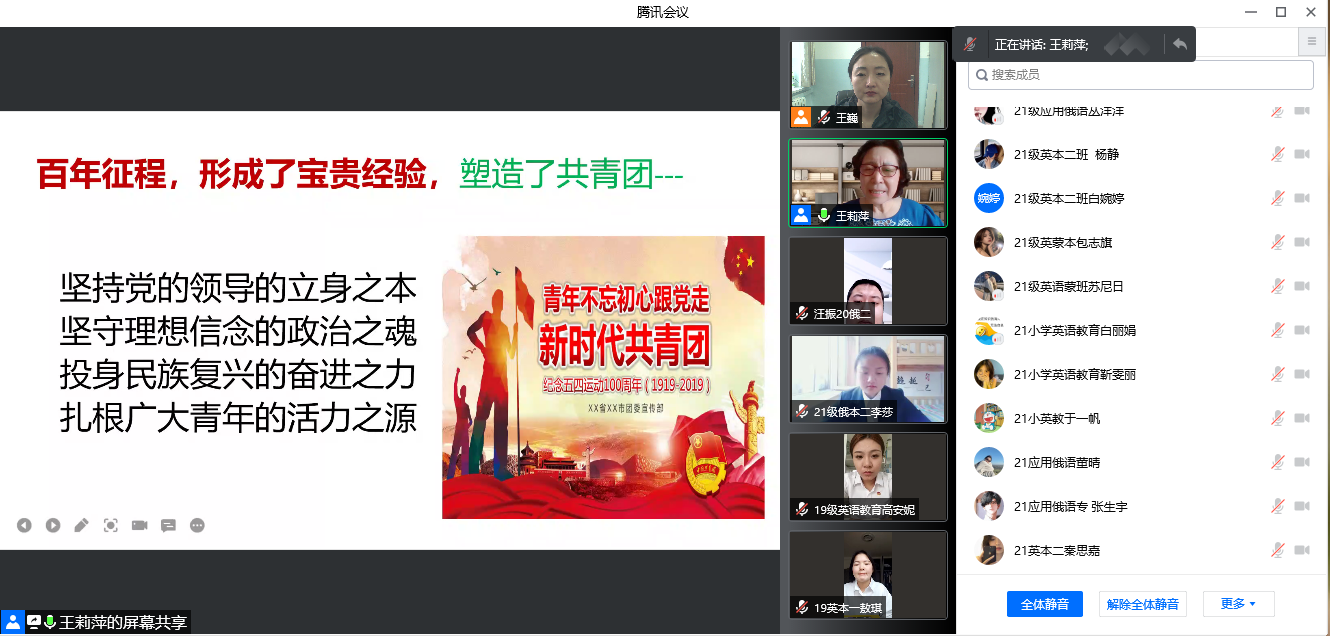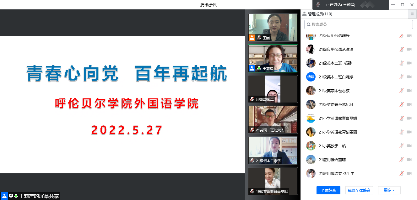 為深入領會習近平總書記在慶祝中國共產主義青年團成立100周年大會上重要講話的重大意義和深刻內涵,5月27日,外國語學院邀請北京青年政治學院王莉萍教授為外國語學院師生帶來“青春心向黨 百年再啟航”主題線上講座。外國語學院入黨積極分子、學生會全體成員130余人參加了講座,講座由外國語學院團總支書記王巍主持。