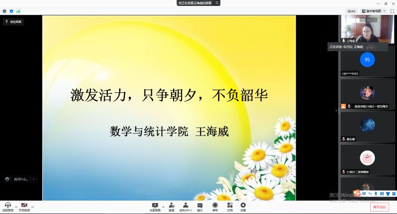 為宣傳普及心理健康知識,深入開展大學(xué)生心理健康教育,促進(jìn)大學(xué)生保持良好的心態(tài),使其健康成長,6月10日下午,數(shù)學(xué)與統(tǒng)計學(xué)院關(guān)工委邀請學(xué)院退休教師王海威做“激發(fā)活力、只爭朝夕、不負(fù)韶華”線上主題講座。數(shù)學(xué)與統(tǒng)計學(xué)院黨總支副書記烏日拉主持講座,2019級、2020級、2021級百余名學(xué)生通過騰訊會議聆聽了本次講座。