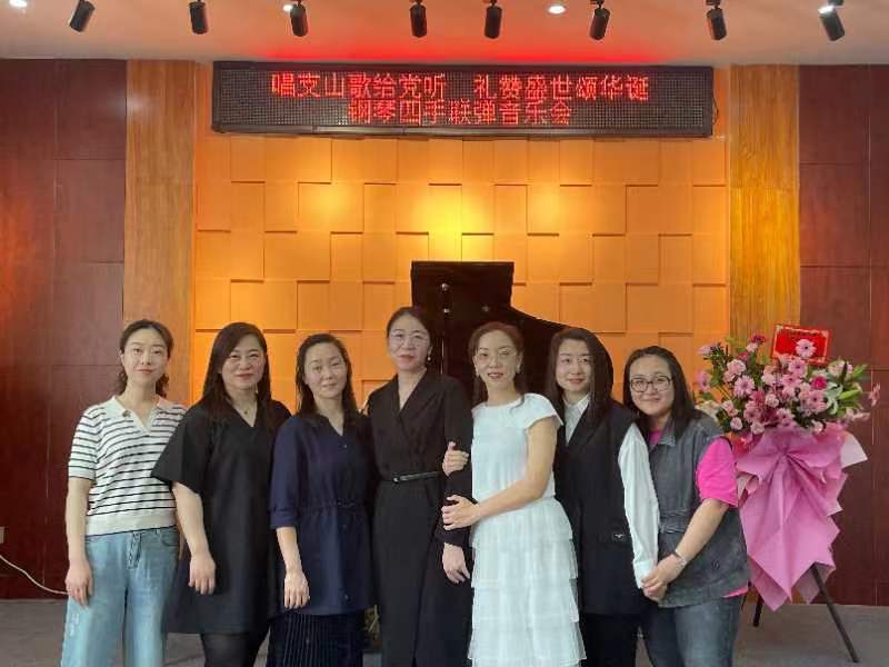 曹楊老師和伊蘭老師演奏了古典樂派、浪漫樂派、現代樂派和中國作品等具有代表性的八首四手聯彈作品。主持人伊拉娜詳細介紹了每首作品的時代背景、音樂內涵。當彈奏中國作品《唱支山歌給黨聽》和《我的祖國》時,喚起了教師和學生對祖國、對黨無限的感恩和熱愛之情,增強了民族自豪感。同時,在音樂會現場和直播間的老師和同學們感受到不同音樂作品傳遞的不同音樂風格和人文情懷。