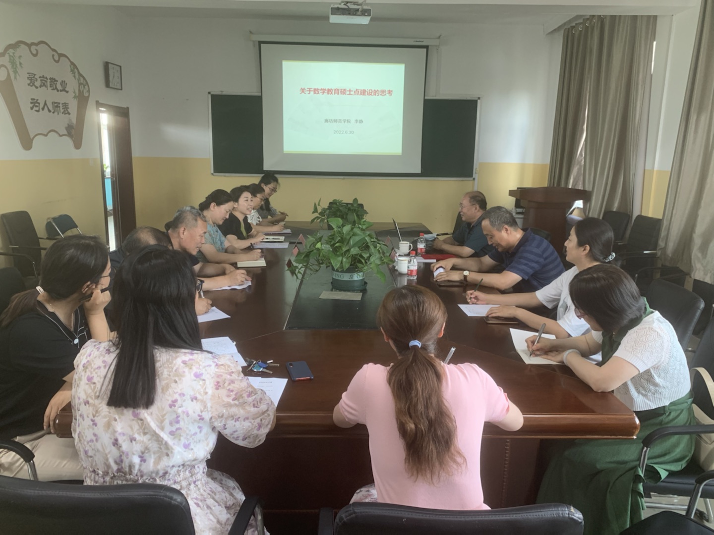 為提高教育碩士學科教學(數(shù)學)學科建設(shè)工作水平,增強碩士研究生培養(yǎng)能力,7月1日下午,數(shù)學與統(tǒng)計學院邀請廊坊師范學院李靜教授指導教育碩士學科教學(數(shù)學)培養(yǎng)工作。人事處李躍武處長,數(shù)學與統(tǒng)計學院黨總支書記宋旭霞、院長張桂芝及碩士研究生授課團隊全體教師參加了此次會議。