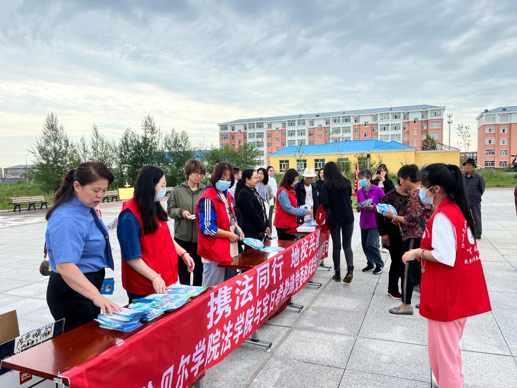 為了促進政府法治工作與法學教育實踐有機結合,提高人才培養質量,充分發揮雙方的資源優勢,7月12日,法學院領導班子帶領法學院部分教師前往寶日希勒鎮政府簽訂共建協議書、融合黨建協議書,共同面向社區居民開展普法活動。