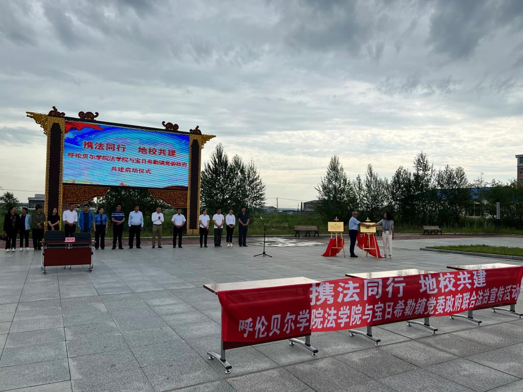 法學院黨總支副書記白杰與栓柱書記共同簽署了呼倫貝爾學院法學院黨總支與中共寶日希勒鎮委員會《融合黨建協議書》;馬斌院長與婧婧鎮長共同簽署了寶日希勒人民政府與呼倫貝爾學院法學院《共建協議書》,并共同完成揭牌儀式。最后,雙方為社區居民進行了細致詳細地普法宣傳,針對百姓提出的問題進行答疑解惑。