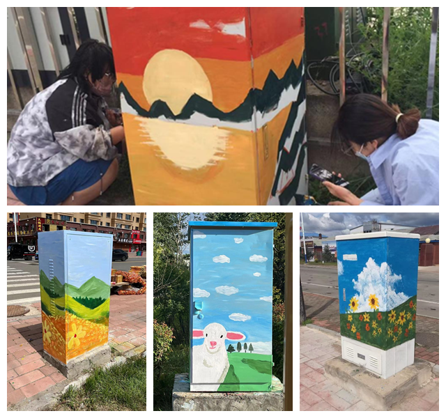 在作品繪制過程中,為了能貼切反應當地民族風貌和地理特點等元素,美術學院師生實地考察了當地的古跡“嘎仙洞”,并進行集中研討,共完成了110余幅作品。光影彩繪在同學們的手中被“請入”城市的各個角落,吸引不少人前來圍觀,得到了群眾的一致好評,同學們還應邀接受了當地電視臺的采訪。