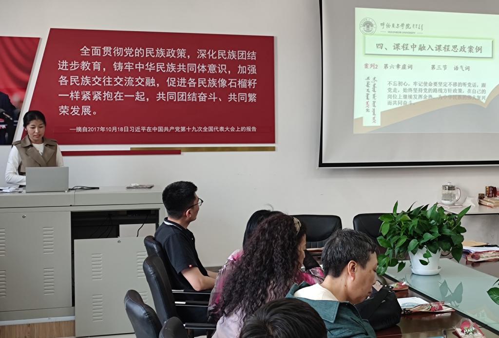 會議由學院教工黨支部書記、副院長小花主持,青春博士、烏云斯琴博士、徐紅云博士、文慧和呼格吉樂瑪老師以說課的方式分別展示了課程思政建設情況。他們從宏觀方面給大家闡述了課程思政建設的三個大方向:一要重視在第一課堂中融入思政元素,注重工匠精神、家國情懷、文化自信等方面的培養。二要重視在科研、實踐、調研等實踐課環節融入思政元素。三要注意合理選擇典型案例、典型項目等。