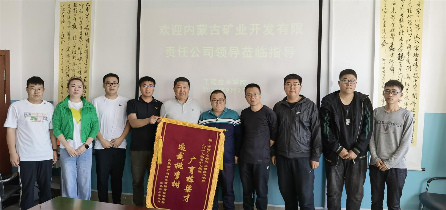9月9日上午,內蒙古礦業開發有限責任公司子公司總經理李鵬,項目部負責人張國鋒等一行人代表公司為工程技術學院送來錦旗,感謝學院為他們輸送了高素質的學生,學院黨總支副書記哈達,實驗實訓中心主任方明偉和團學辦的輔導員老師一起接待了企業的領導。