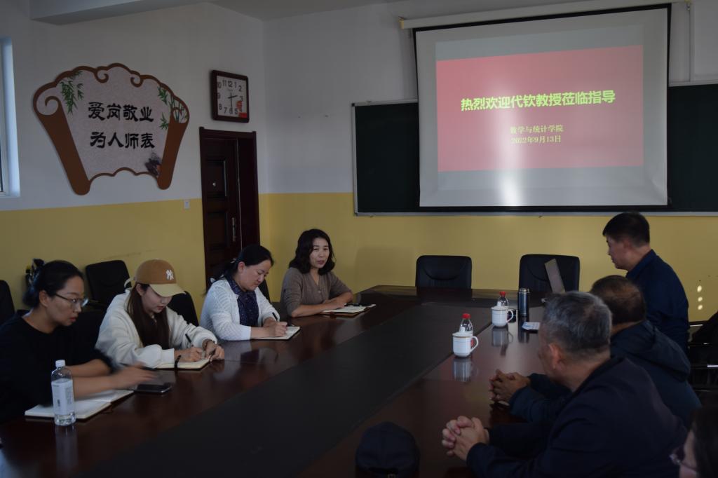 9月13日下午,數學與統計學院邀請內蒙古師范大學代欽教授指導教育碩士學科教學(數學)研究生導師論文選題工作,學院院長張桂芝主持會議,黨總支書記宋旭霞及研究生任課教師參會。